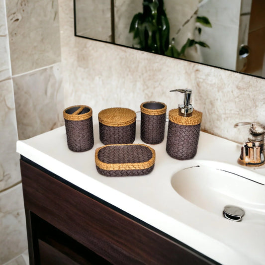 Nature Home Decor's 5-Piece Bathroom Accessory Sets combine premium materials with practicality to inject a luxurious touch to any bathroom. Perfect for home and commercial spaces, these sets provide a refined atmosphere of sophistication and extravagance.